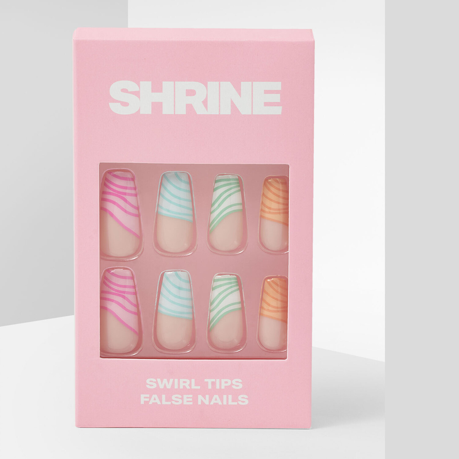 Channel those summer vibes with the Shrine Swirl Tips False Nails. The classic coffin shape and bright, swirly design makes these the go-to to amp up your nail looks. The eye-catching design and complementing colour means that they’ll go with any look, making them a must-have.
